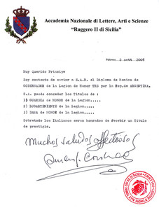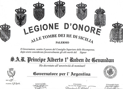 Le Gouvernement de la Légion d'Honneur au Tombeau du Roi de Sicile, à Palerme, a nommé Son Altesse Royale le prince Rubén Alberto de Gévaudan comme Gouverneur de la même pour le territoire de l'Argentine. La désignation est enregistrée sous le numéro d'enregistrement 35 et datée du 1er septembre 2006.